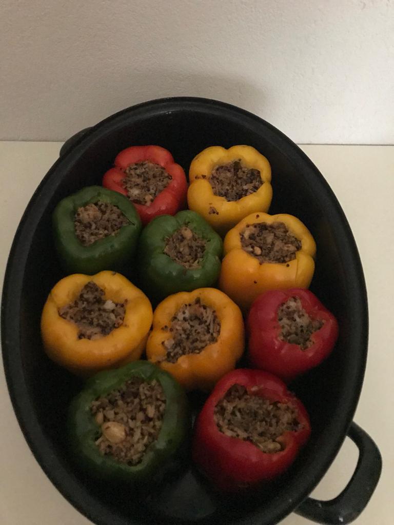Was haltet ihr von gefüllten Paprikaschoten? Frischem Salat und einem Nachtisch von Früchten der Region?